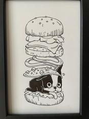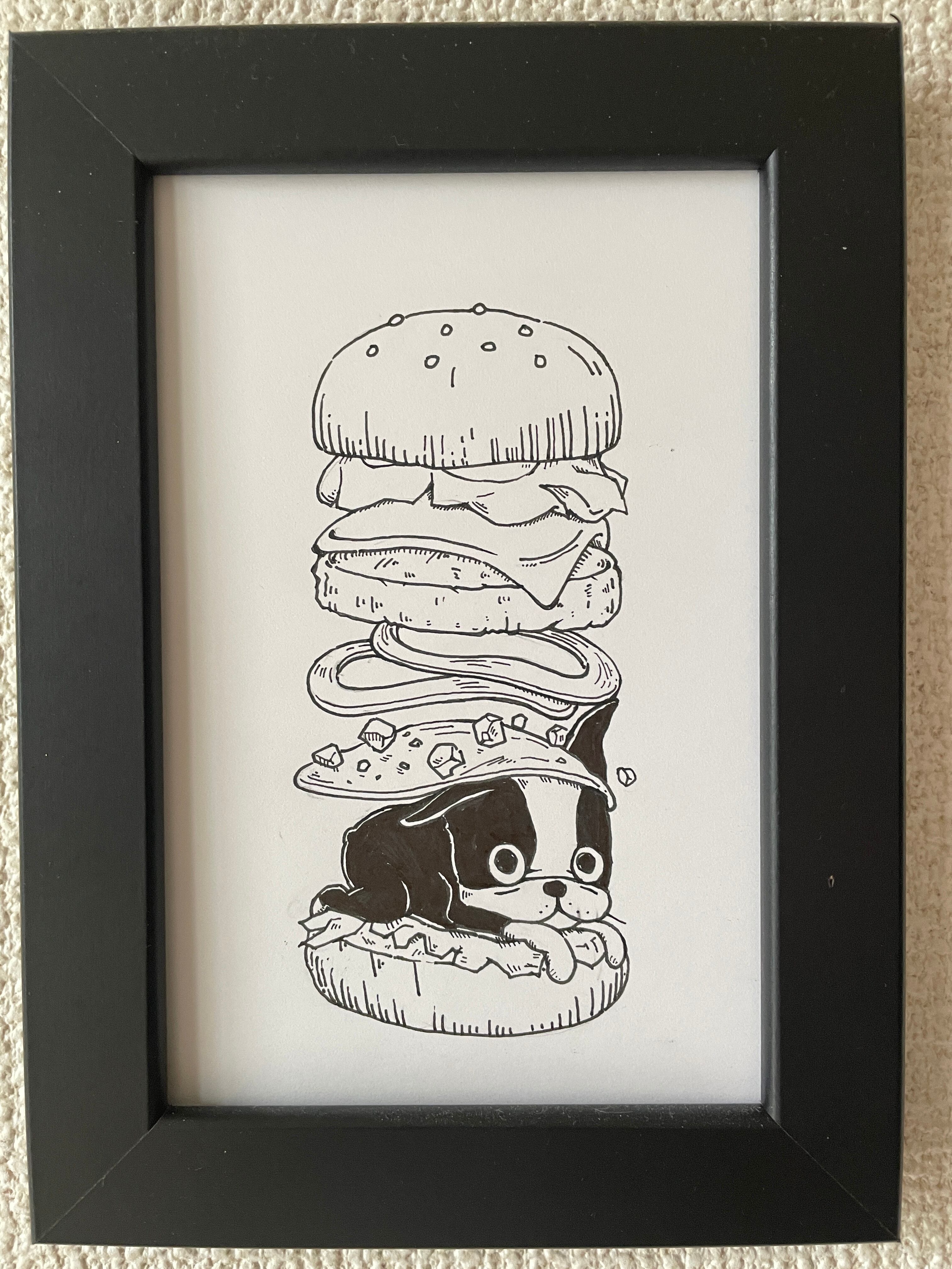 ボストンテリア ハンバーガー手描きイラスト 原画