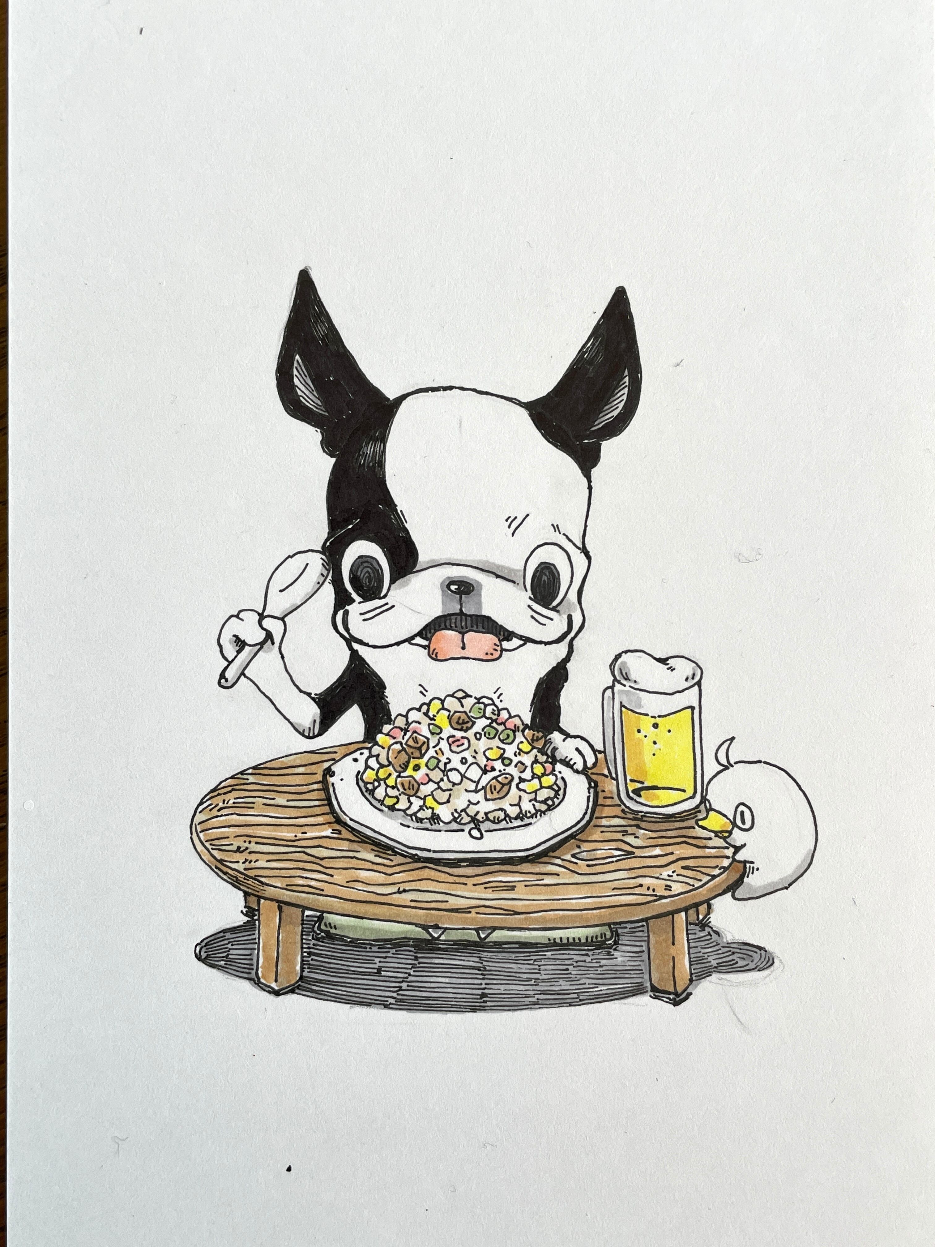 ボストンテリ チャーハンとビールで乾杯手描きイラスト 原画 | ぼすとんず