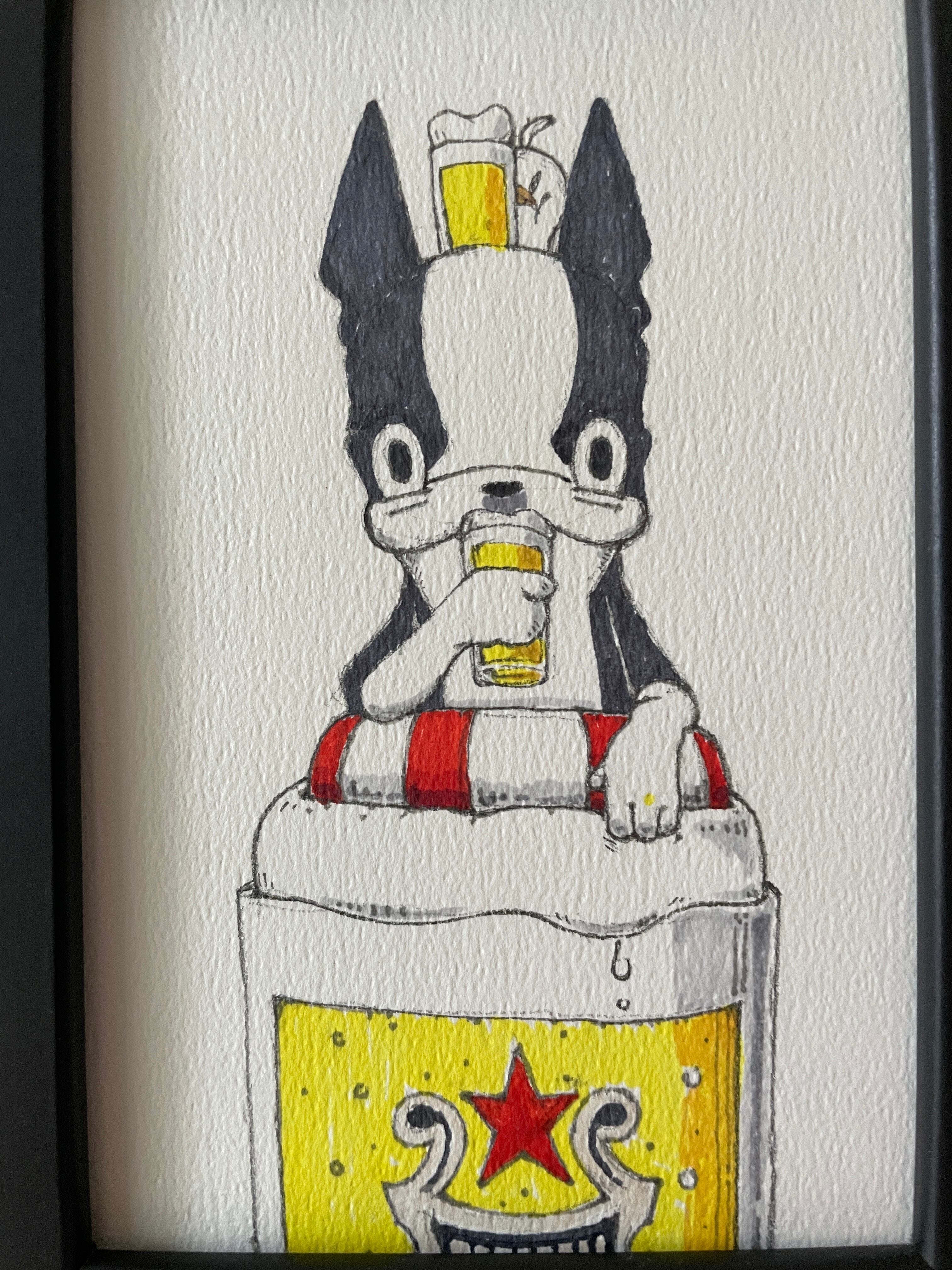 ボストンテリア 乾杯プール手描きイラスト 原画 | ぼすとんず