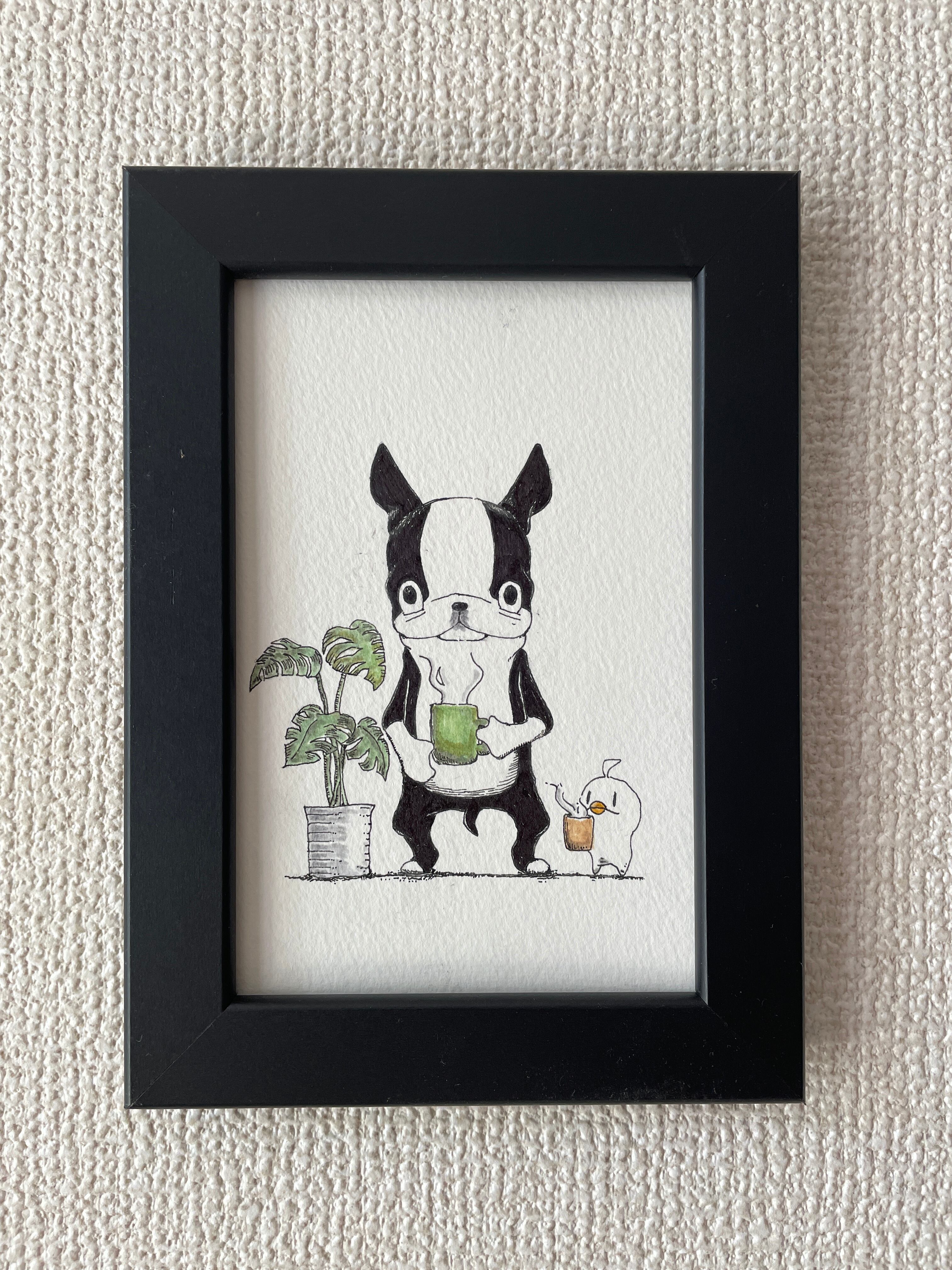 ボストンテリア コーヒータイム手描きの手描きイラスト原画