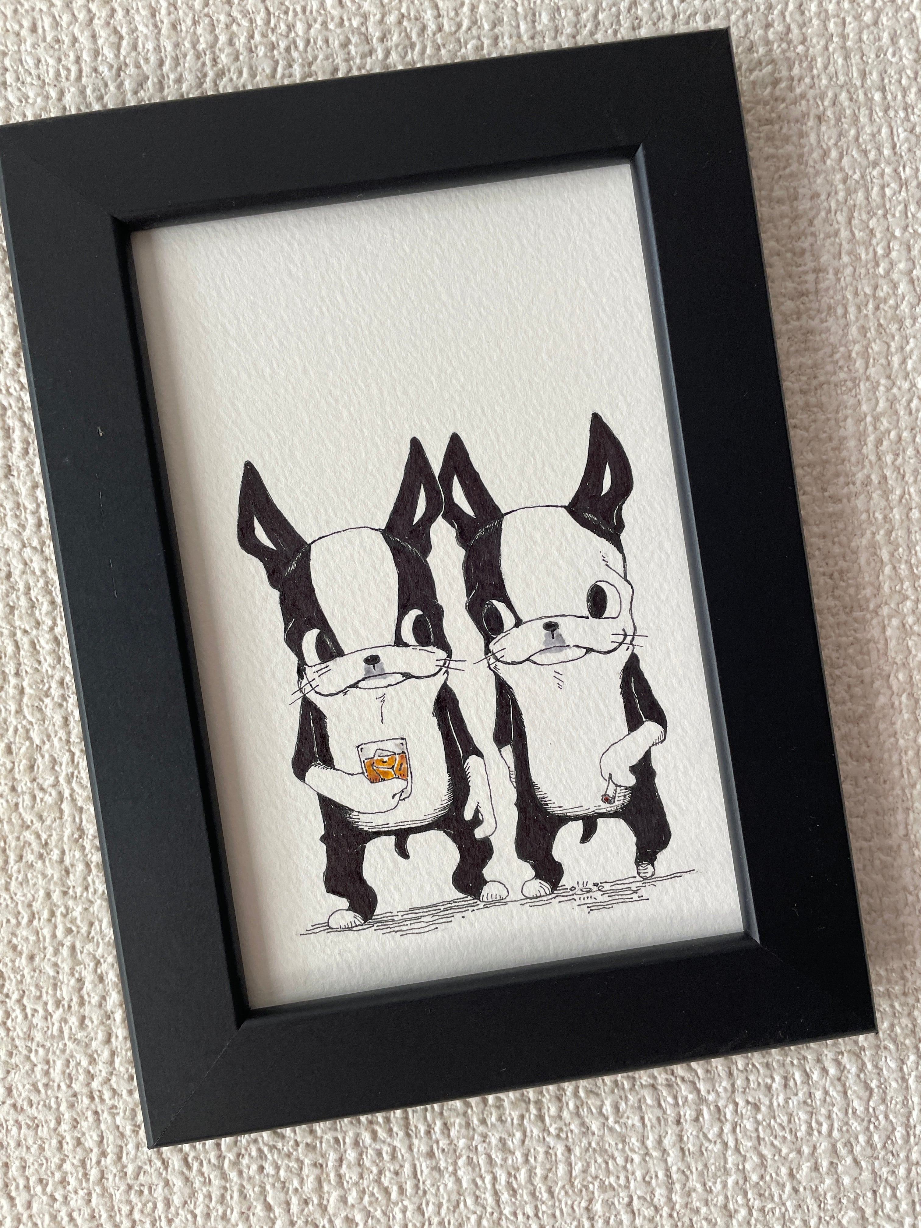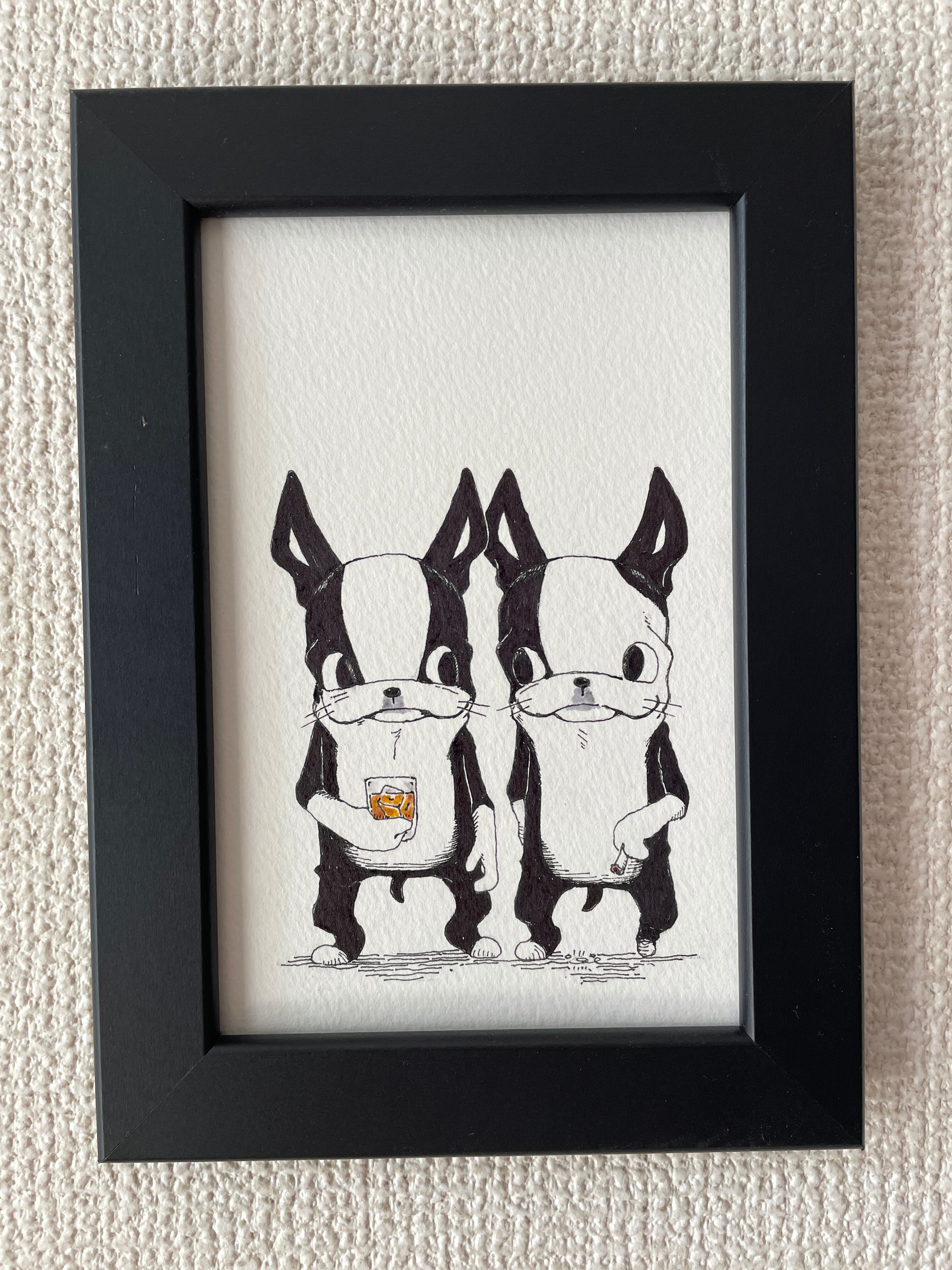 ボストンテリア スモーキーバーボンの手描きイラスト原画