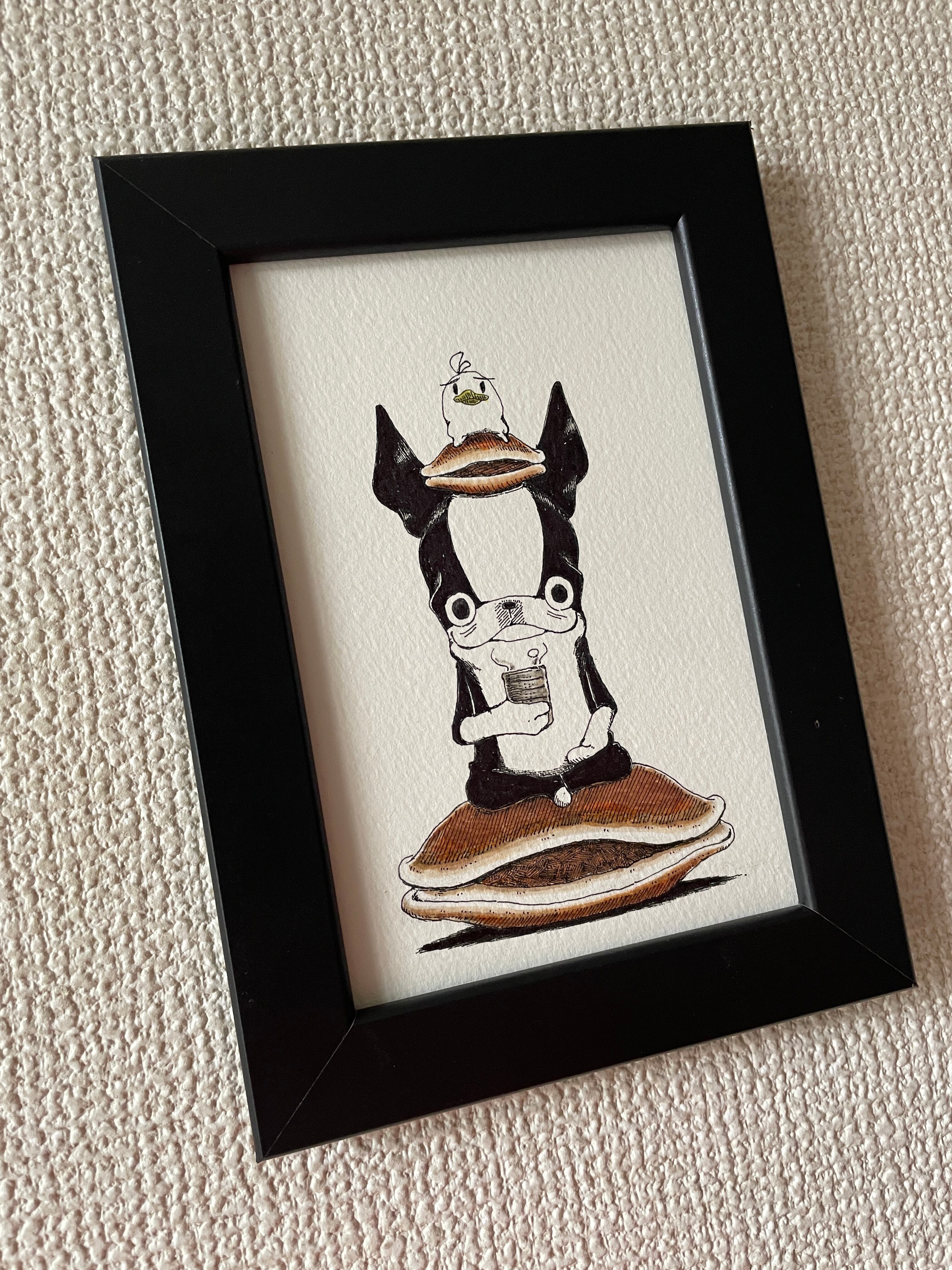 ボストンテリア お茶とどら焼きの手描きイラスト原画